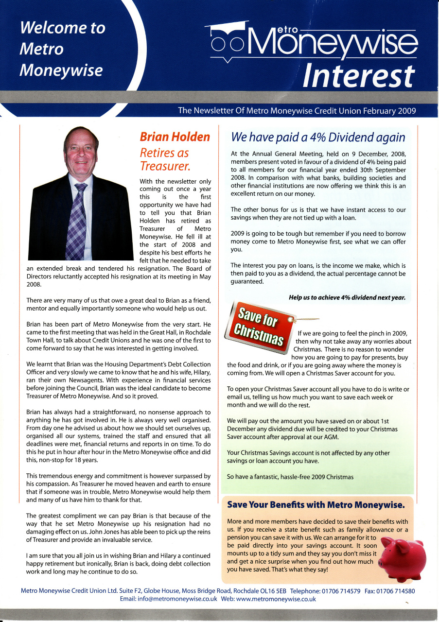 2008 Brian Holden Retires as Treasure and John Jones takes up the post Brian was one of the key Founding Fathers of the Credit Union.
